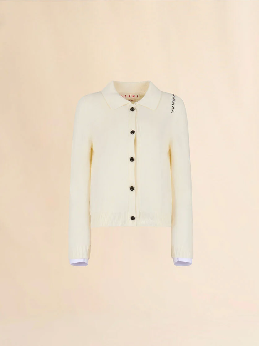 Cardigan knitted from sheeny mercerised cotton with a satin finish. Regular fit with long sleeves and collar. Contrast buttons. Hand-embroidered Marni Symbol on the shoulder. MODEL CDMD0404A0UFCN5500W08 COMPOSITION Primary Fabric: 100% Cotton Knit