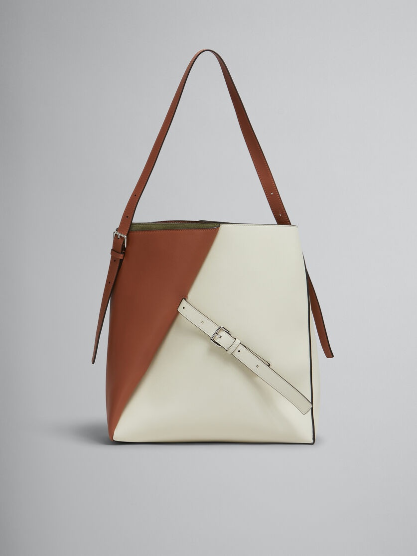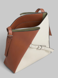 Reverse hobo bag crafted from calfskin leather. Two-tone design. Trapeze silhouette, folded in at the corners and secured with decorative buckled straps. Adjustable buckled shoulder strap. Suede leather lining and inside pocket. Made in Italy MODEL SBMP0190U1P6947ZO819 COMPOSITION Body: 100% Calf Leather - Lining: 100% Calf Leather - Inside: 100% Calf Leather - Metallic Parts: 100% Zama