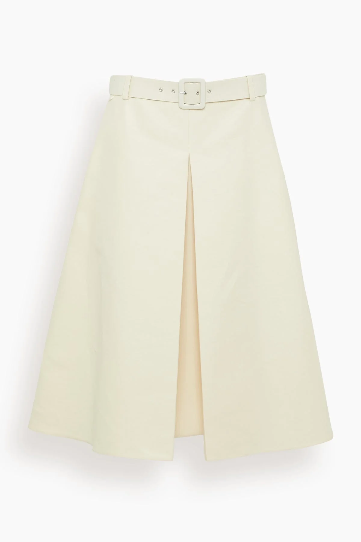 The Marni Cotton A-Line Skirt in Ivory is a cotton cady flared midi skirt with a deep center pleat at the front and matching belt. - Semi-low waist and side pockets - Side closure - A Marni Symbol is hand embroidered on the side - Made in Italy - 100% Cotton Woven - Pocket Lining: 100% Cotton Woven