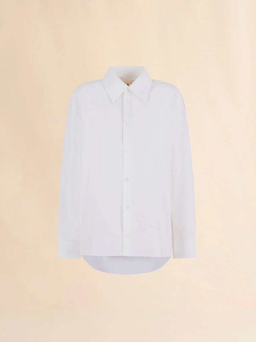 Long-sleeved shirt made from organic cotton poplin. Oversized fit with gathering on the back, creating a voluminous cocoon silhouette. Front button closure and classic collar. Hand-stitched Marni mending logo on the cuff. MODEL CAMA0593S1UTC22300W01