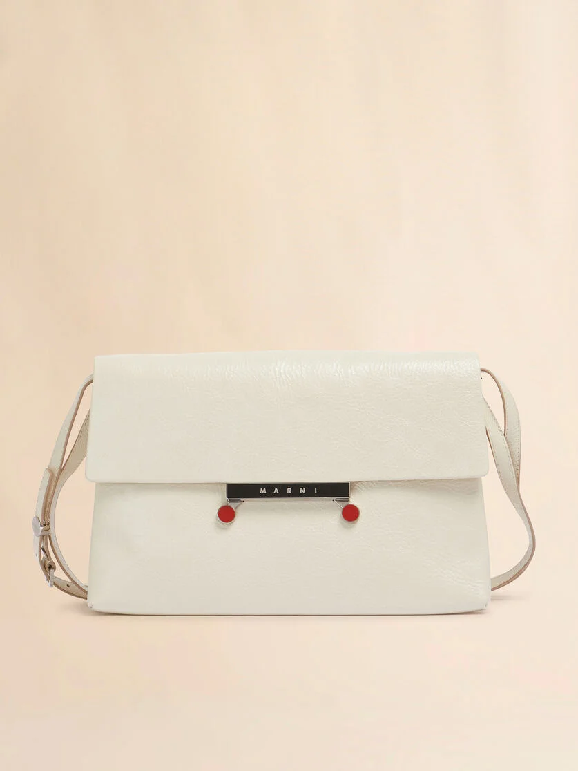 Medium Envelope bag made from patent leather with a tactile craquele effect. Semi-rigid construction with two inside compartments. Open pocket in the front one, zip pocket in the back. Adjustable buckled shoulder strap: can be worn as a shoulder bag or crossbody. Flap closure with enamelled Marni clasp. Luxurious sheepskin leather lining. Made in Italy MODEL SBMP0228U0P828700W04 COMPOSITION Body: 100% Calf Leather - Contrast: 100% Calf Leather - Lining: 100% Ovine Leather - Metallic Parts: 100% Brass - Metallic Parts: 100% Zama