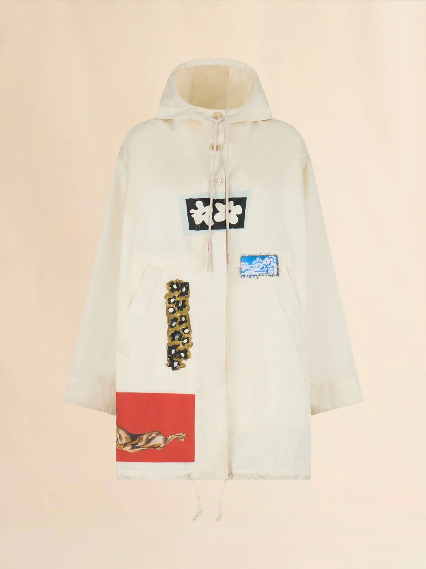 Hooded parka made from cotton blend taffeta, featuring prints and a patch that embody creativity and individuality. Hand-embroidered Marni Mending. Relaxed fit with button closure, front pockets and buttoned cuffs. Drawstrings at the hood and hem. Unlined. Part of the Artists’ Capsule Collection: an exclusive collab between Creative Director Francesco Risso and artists Soldier Boyfriend and Olaolu Slawn. Made in Italy MODEL JKMA0366SXUSCY3000W06