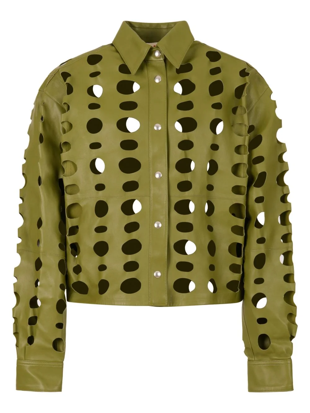 cut-out leather shirt Highlights - Green - Circular cut-outs - Long sleeves - Snap button closure Made in Italy Composition Calf Leather 100% Washing instructions Read Manufacturer Guidelines