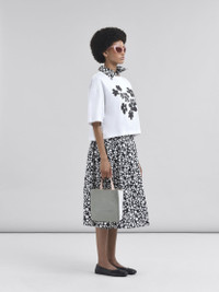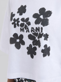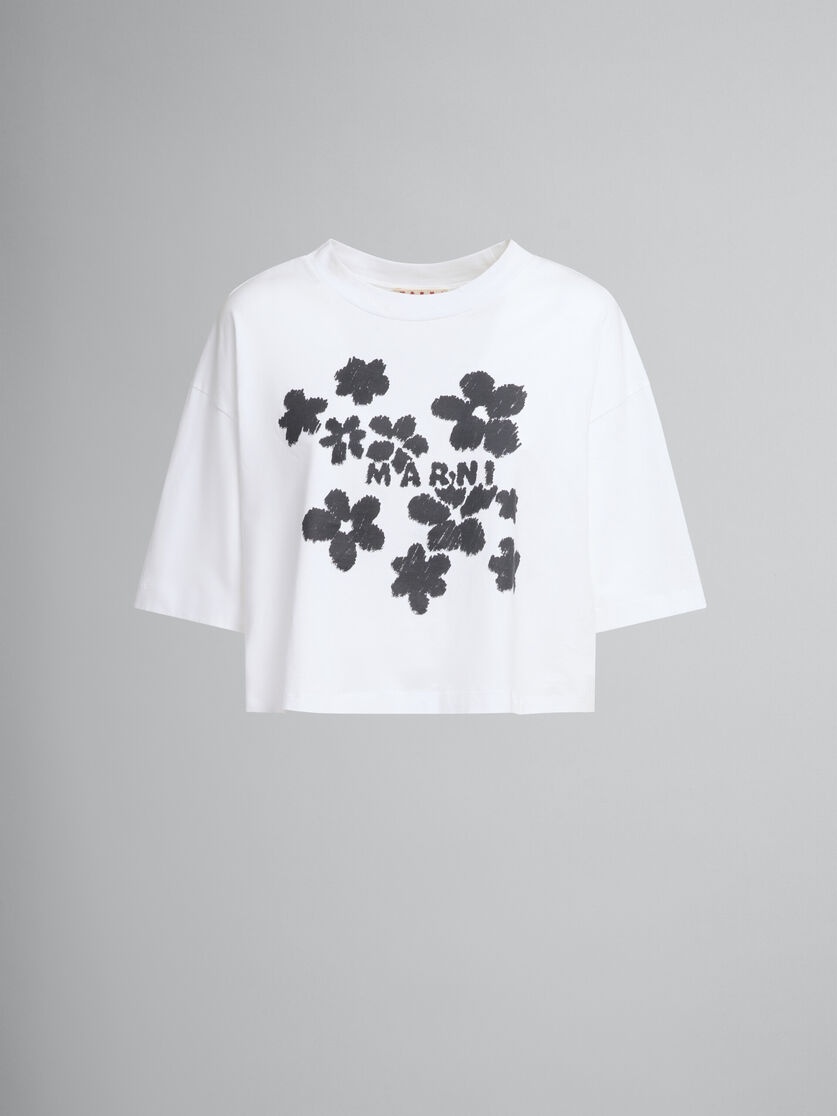 Short sleeved jersey cotton T-shirt with a boxy, cropped cut. The seasonal Daisy Garden pattern is printed with a Marni logo on the front. MODEL THJE0333P4USCX40D1W01 FIT The model is 5' 9''. The model is wearing size 40 IT. COMPOSITION Primary Fabric: 100% Cotton Knit