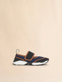 Mary Jane ballet flat and running sneaker hybrid, made from stretch lycra. Two-tone design with bold contrast piping. Unstructured slip-on style with wide velcro strap. Logo pull tab on the heel. Soft rubber sole. Made in Italy MODEL SNZW020602P7613ZP081
