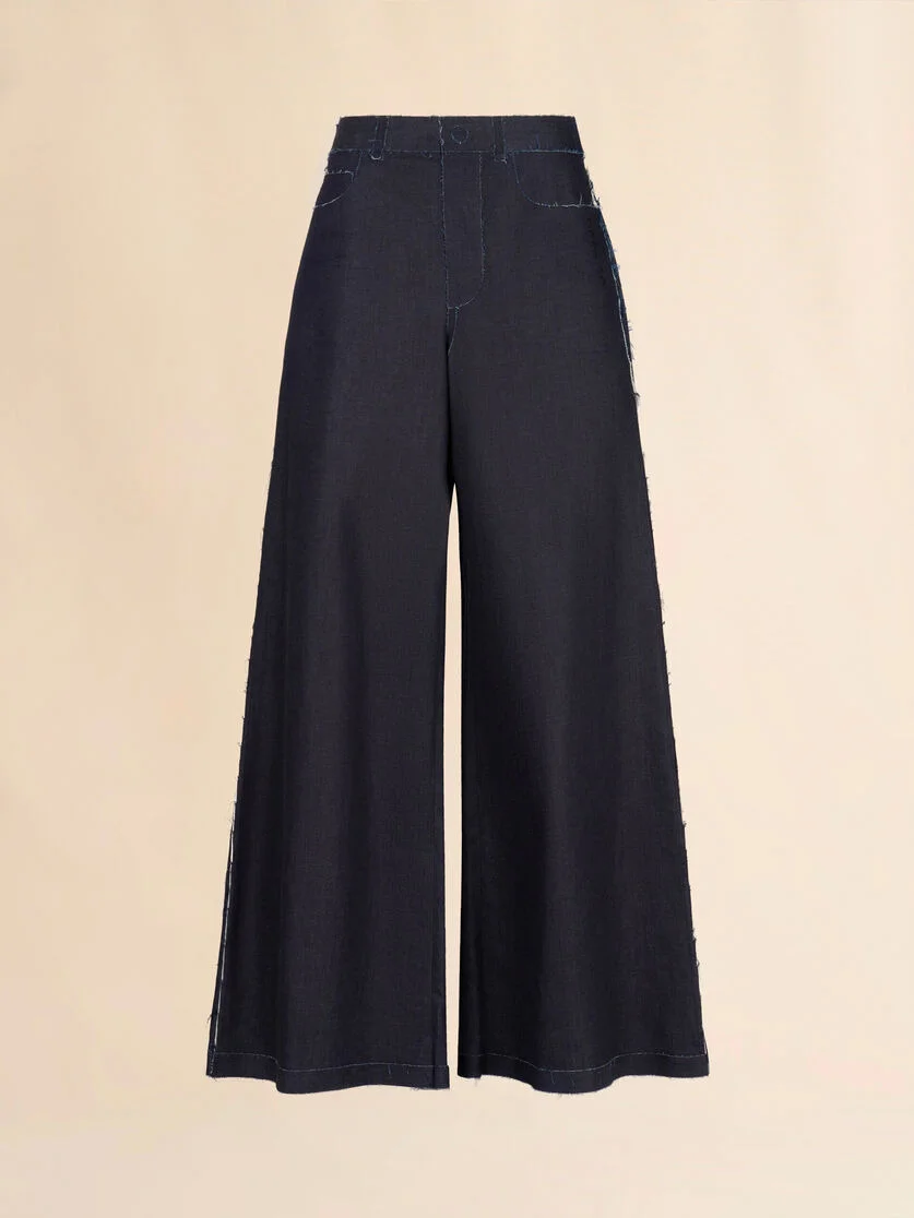 Low-rise trousers made from bonded stretch denim. Wide-leg cut. Trompe l'oeil five-pocket design, with classic two-needle stitching mimicked through raw-edge glued overlays. Hand-stitched Marni Symbol on the side. Side zip closure. Made in Italy MODEL PAJD0591SYUSCX59UNB99 COMPOSITION Primary Fabric: 98% Cotton Woven 2% Elastan Woven