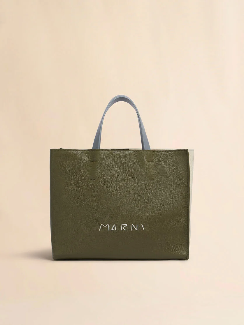 DEEP GREEN CREAM AND BLUE LEATHER MUSEO SOFT TOTE BAG WITH MARNI MENDING