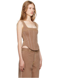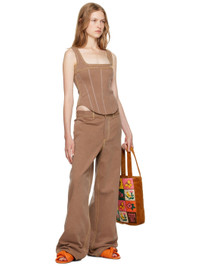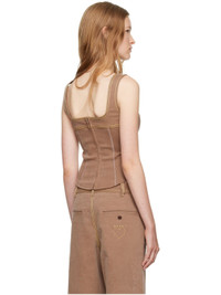 Stretch denim corset-style tank top. · Square neck · Hand-stitched logo and graphic at chest · Curved hem · Zip closure at back · Contrast stitching in yellow and purple Part of the High Summer collection, featuring artwork by Alake Shilling. Supplier color: Raisin