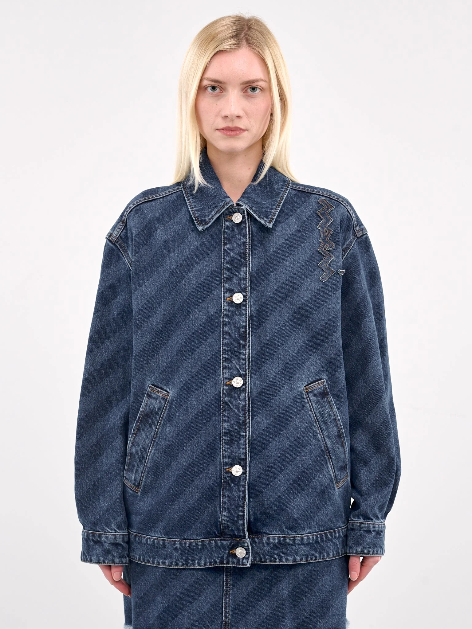 MARNI jacket in blue, paneled denim construction, diagonal pattern, spread collar, front button placket closure, shoulder logo embroidery, long sleeves, button cuffs, side welt pockets, hem adjustable button straps, straight hem, relaxed fit. Made in Italy 100% Cotton Italian Sizing Model is 5'6" wearing size 40. Bust: 30" Waist: 24" Hips: 36"