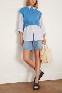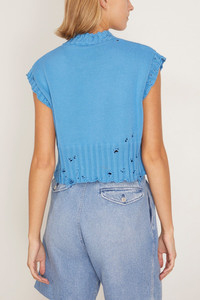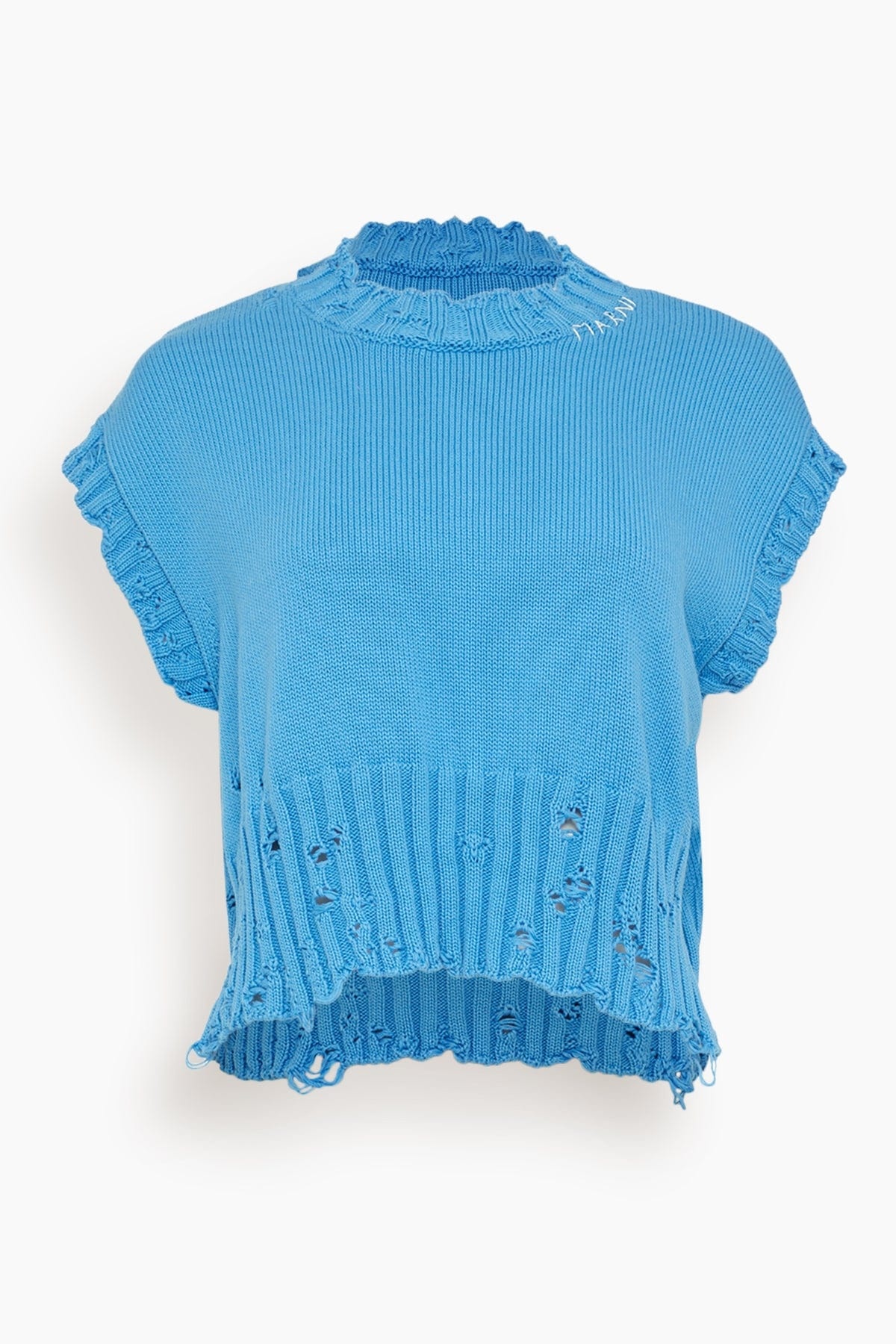 The Marni Roundneck Sweater in Azure is a short-sleeved pure cotton sweater with Marni Symbol hand embroidered on the back of the neck. The main fiber in this garment is made using at least 50% of highly selected organic cotton, grown using farming practices that support biodiversity and healthy ecosystems. - Made in Italy - 100% Cotton