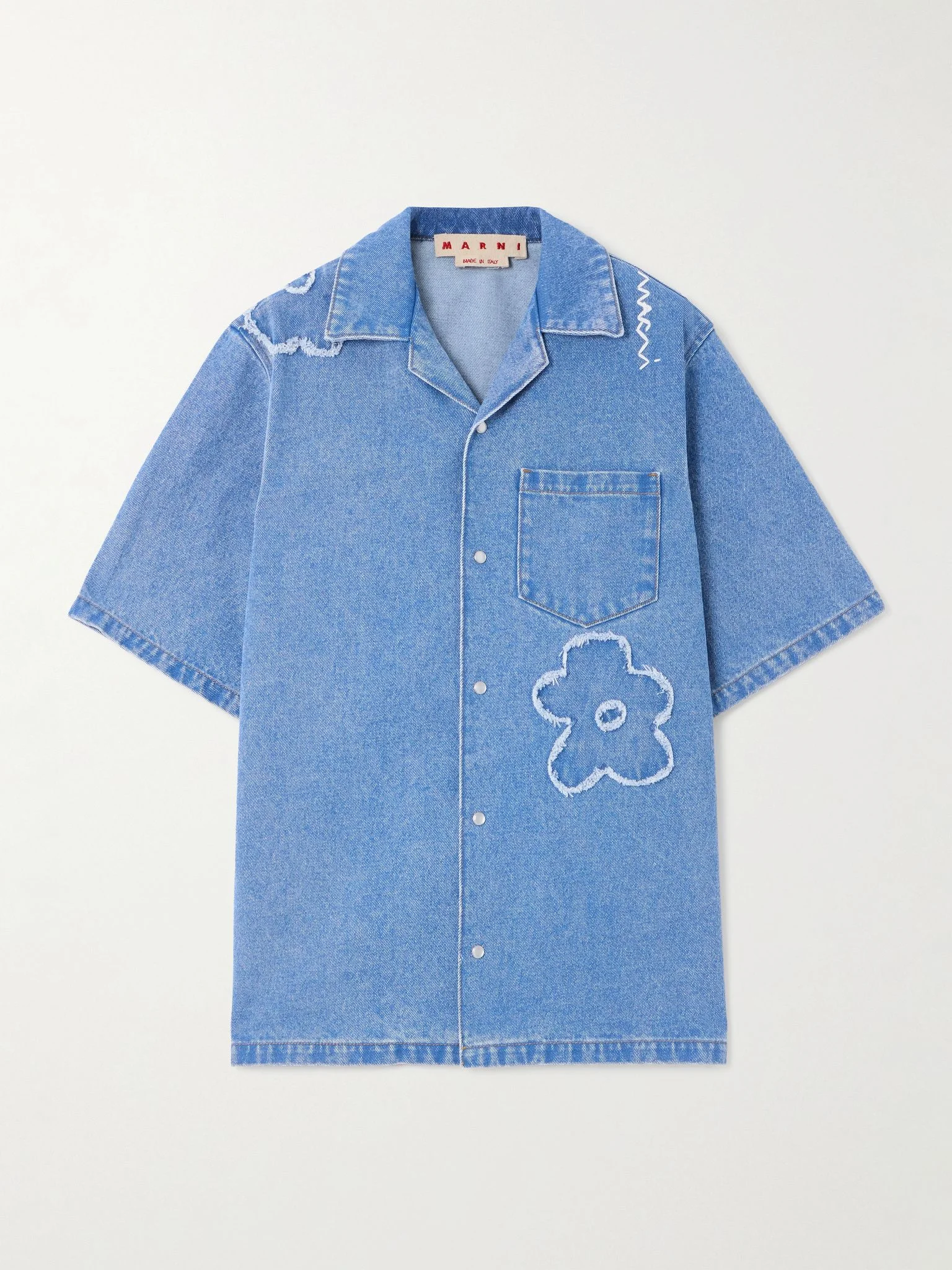 Marni's shirt features frayed flowers throughout - a key motif seen through the latest collection. It's cut from denim and has a camp collar and the brand's logo embroidered on the shoulder. Wear yours as a set with the matching jeans. Size & Fit - Fits true to size, take your normal size - Those with broad shoulders may wish to take the next size up - Designed for a slightly loose fit - Lightweight, non-stretchy denim - Model is 180cm/ 5'11" and is wearing an IT 40 Model measurements: - Bust: 86cm/ 34" - Waist: 65cm/ 25.5" - Hip: 90cm/ 35.5" Details & Care - Blue denim - Snap fastenings through front - 100% cotton - Hand wash