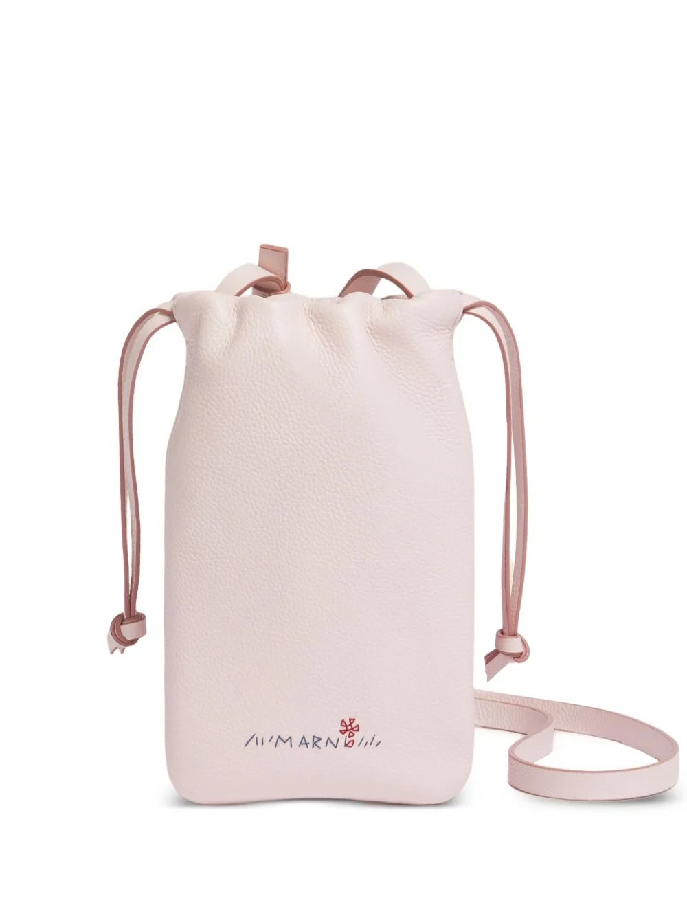 embroidered-logo drawstring phone holder Highlights - Pink - Calfskin leather - Embroidered logo - Flower detail - Leather draw cords - Shoulder strap Made in Italy Composition Outer: Grained Calf Leather 100%