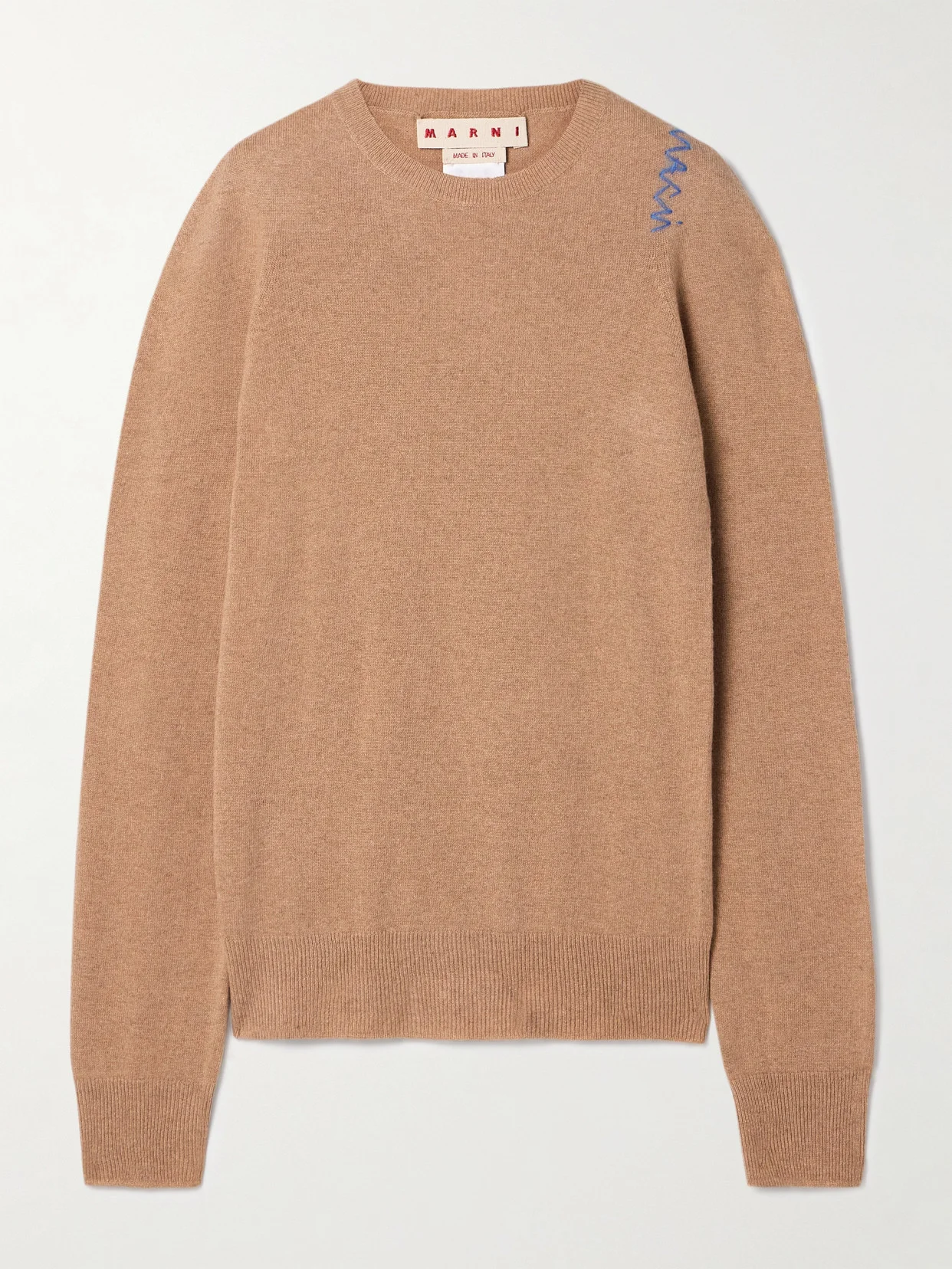 Marni's sweater has been made in Italy from fine wool and cashmere-blend and is stitched with the brand's name in a jagged lettering along the shoulder. The ribbed trims temper the relaxed fit nicely. Wear it with everything from jeans to midi skirts.