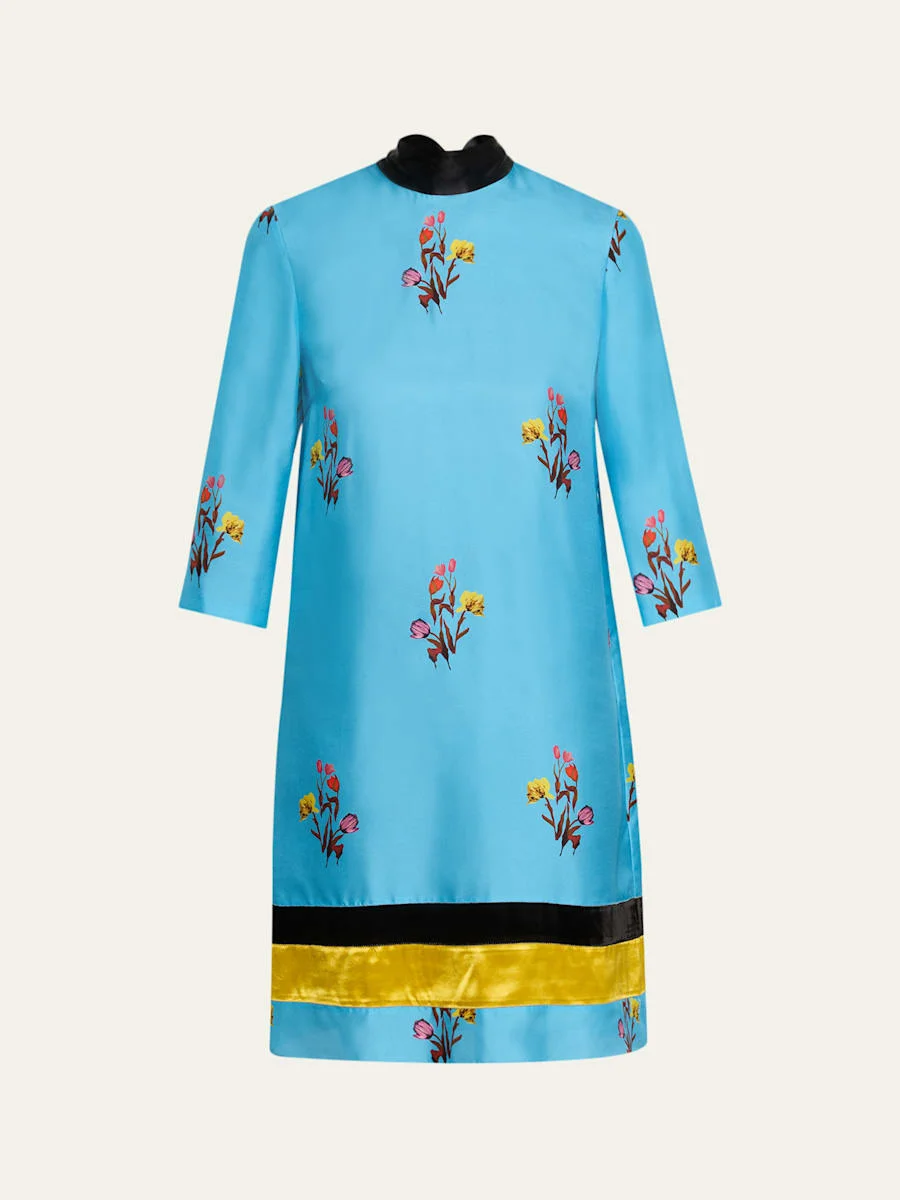 Floral Twill Mock-Neck 3/4-Sleeve Dress