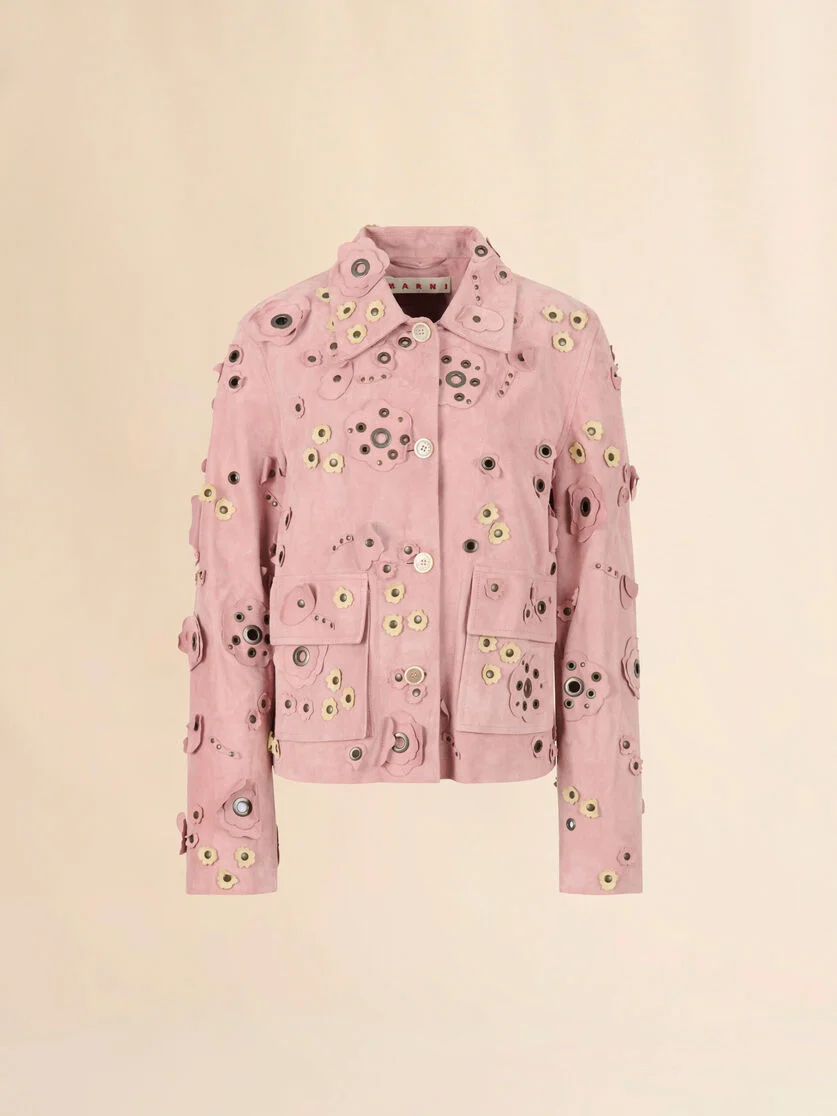 Single-breasted jacket made from soft suede. All-over front daisy appliques with metal studs and eyelets. Button closure and cargo pockets. Made in Italy MODEL GIMX0326X0ULA76100C20