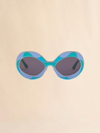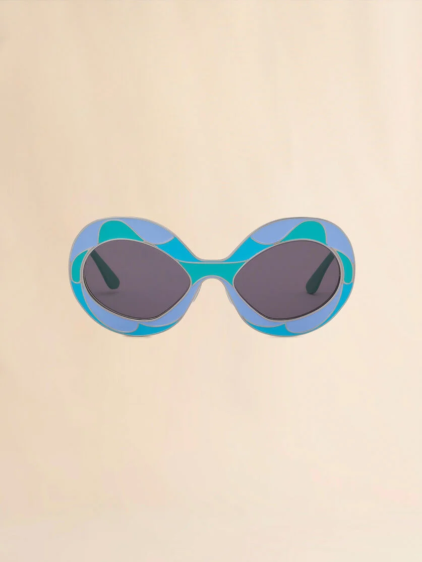 Land of Revelations sunglasses, crafted from sleek metal. Mosaic front with multicoloured enamel finish. Sculpted temples with graphic curved lines, featuring engraved Marni lettering and contrast end tips. Made in Italy MODEL EWME0083M0H390002GCM COMPOSITION Material: 70% Metal 10% Acetate 20% Resin