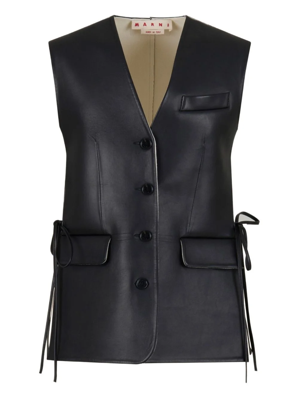 front-button leather gilet Highlights - Black - Front button fastening - Side tie details - Two patch pockets Made in Italy Composition Outer: Ovine Leather (top grain) 100%, Virgin Wool 75%, Polyamide 20%, Cashmere 5% Lining: Cotton 100%
