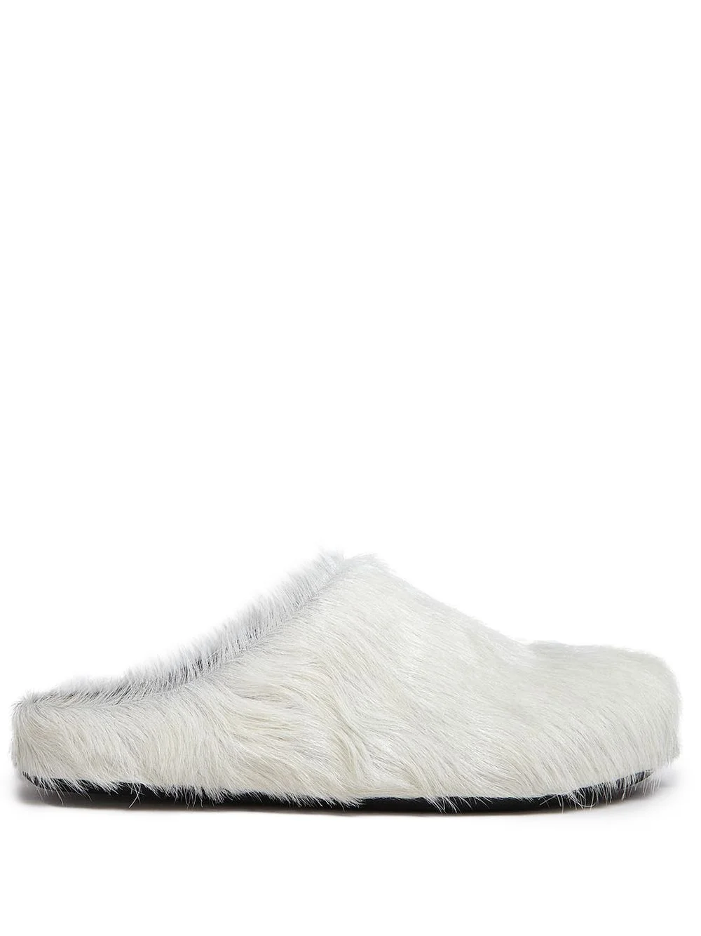Fussbett Sabot mules white calf hair/leather fur trim round toe branded insole flat rubber sole Made in Italy Composition Outer: Calf Hair 100% Lining: Leather 100% Sole: Rubber 100%