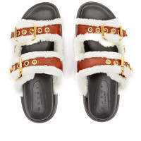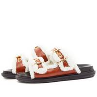 Marni's fan-favourite Fussbett sandals just got a warm and fluffy makeover. In a butter-soft and rich tan leather with double straps, the lining is upgraded to a soft merino. Underfoot sits a moulded footbed and they’re fastening with chunky gold-toned buckles. - Calf Leather Uppers - Merino Lining - Rubber Outsole