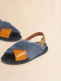 Iconic crisscross Fussbett sandal, crafted from a refined two-tone combination of smooth kidskin leather and long-hair calfskin. Adjustable buckle strap. Anatomical leather insole and non-slip rubber outsole. Raised Marni lettering on the heel. Made in Italy MODEL FBMS018101P7614ZP083