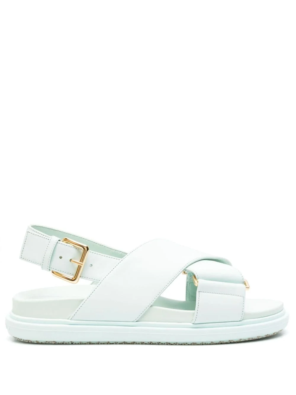 Fussbett slingback sandals This pair of Marni's Fussbett sandals spotlight the brand’s ‘experimental approach to material and colour.’ They’re crafted from ice-blue leather with wide crossover straps and jute trims at the sole. The moulded footbed and adjustable slingback strap reinforce their practicality. Highlights - Ice blue - Calf leather - Smooth grain - Crossover top straps - Round open toe - Moulded footbed - Branded leather insole - Flat rubber sole - Jute trim - Gold-tone hardware - Buckle-fastening slingback strap - This piece comes complete with a protective dust bag. Made in Italy Composition Leather 100% SIZE & FIT Measurement HEEL 1.37 in(3.5 cm) Sole height 0.78 in(2 cm)