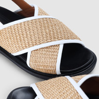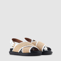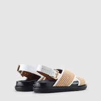 - Multi - Cotton/Nylon - Leather Inner & Lining - Rubber & Jute Sole - Leather Back Strap with Gold Metal Buckle - Anatomical Insole - Marni Branding Inviting a casually luxurious look, Marni’s popular Fussbett Shoe Multicoloured Sandals are the perfect footwear for summer adventures. Made from a cotton and nylon raffia upper, the pair features crossed front straps and a back strap buckle closure. Sitting atop a rubber and jute outsole, the sandals are also cushioned with an anatomical insole for added comfort, making them ideal for long strolls and on-the-go days. Style the Fussbett Sandals with casual day-wear for a cool, relaxed look. Signature Marni branding is seen throughout. Fits true to size, take your normal size