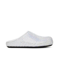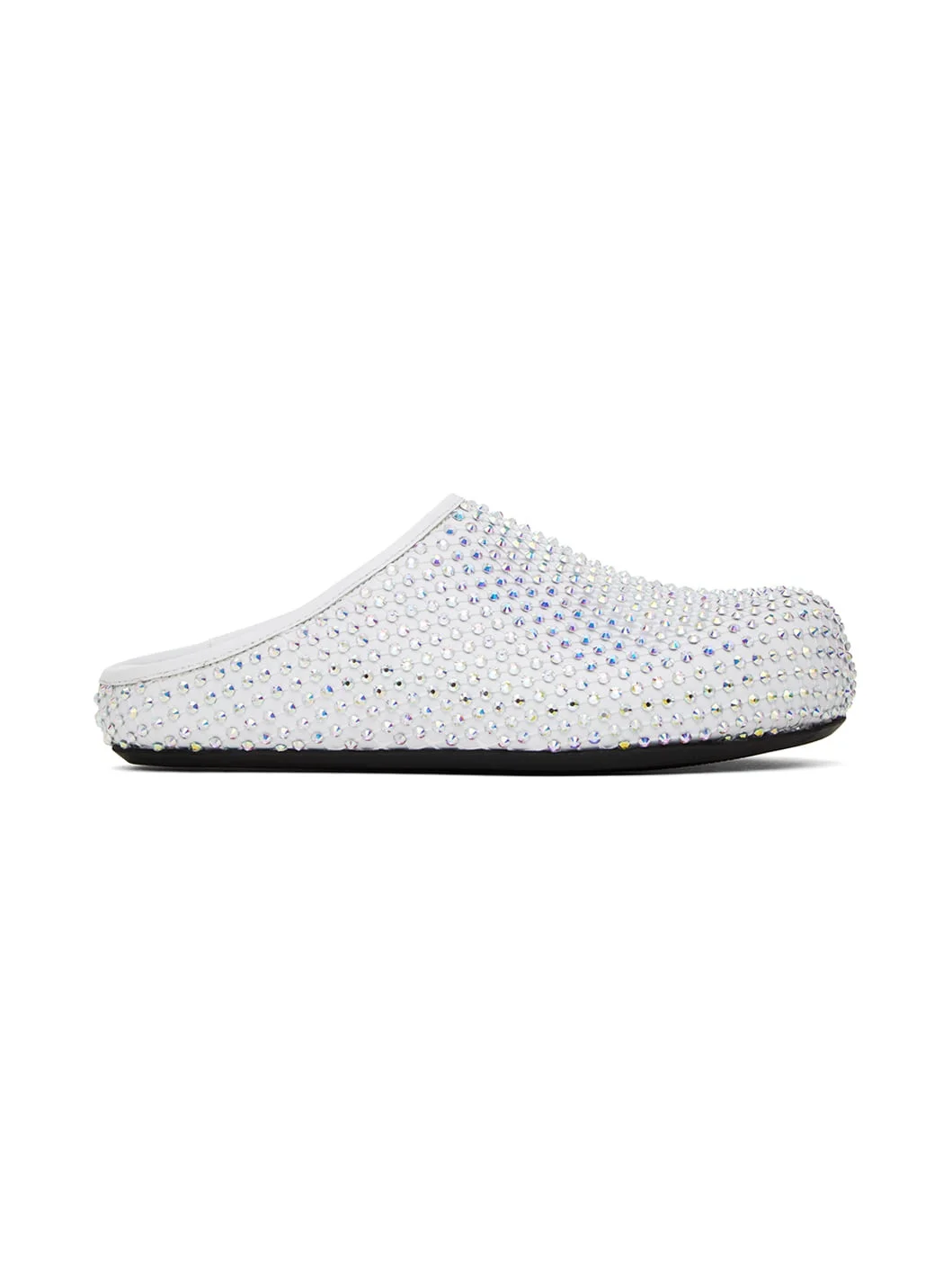 Buffed leather slip-on loafers in white. · Crystal-cut detailing throughout · Logo-embossed molded footbed · Treaded rubber sole Supplier color: Lily white Upper: leather. Sole: rubber. Made in Italy 241379F121007