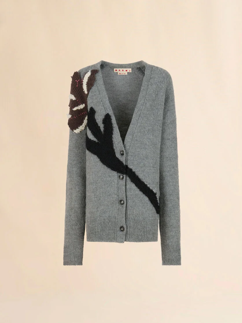 GRAY ALPACA WOOL CARDIGAN WITH FLOWER PATCH