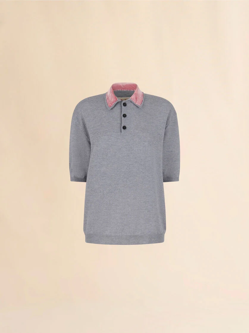 GRAY WOOL POLO SHIRT WITH VELVET COLLAR