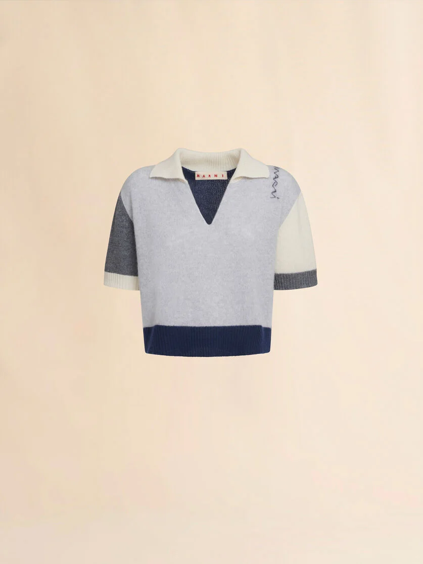 Short sleeved colour block cashmere polo shirt with a boxy silhouette, and V-neck. Ribbed knit trims, and a Marni Symbol hand embroidered on the left shoulder. Made in Italy MODEL CVMD0150EQUFX385BLN15 FIT The model is 5' 10''. The model is wearing size 40 IT. COMPOSITION Primary Fabric: 100% Kashmir Knit