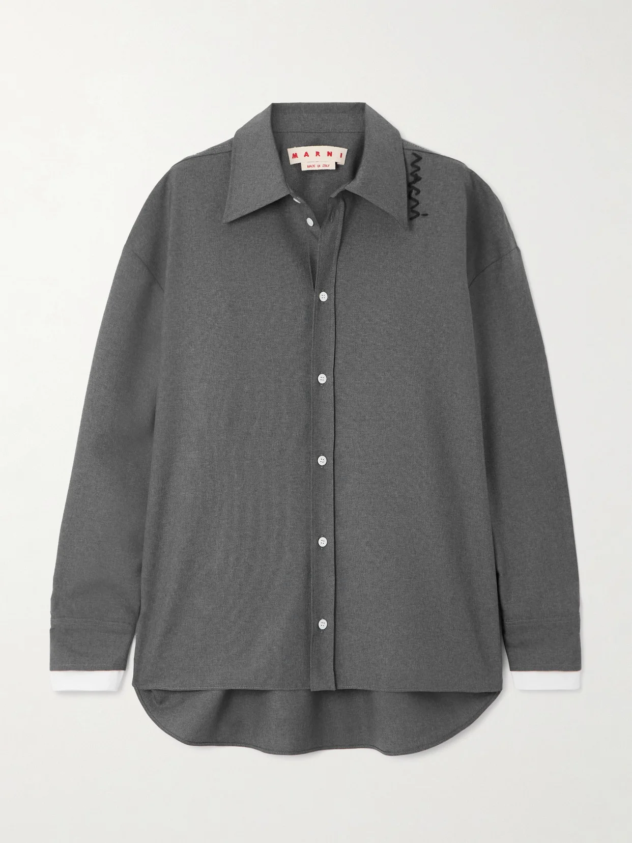 Marni's shirt is hand-embroidered with the label's cursive logo over the left shoulder, making it instantly recognizable to those in the know. It's been made in Italy from gray wool and has a pointed collar and white-tipped buttoned cuffs.