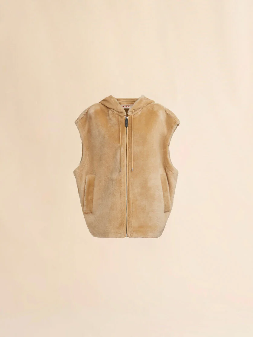 Hooded gilet crafted from merino shearling with a plush shaved finish. Loose fit with dropped shoulders, tonal drawstrings and welt pockets. Zip closure. Made in Italy MODEL GLMX0086A1ULM094ROW60 FIT The model is 5' 11''. The model is wearing size 40 IT. COMPOSITION 100%Lambskin Leather, Application 100%Cowhide Leather