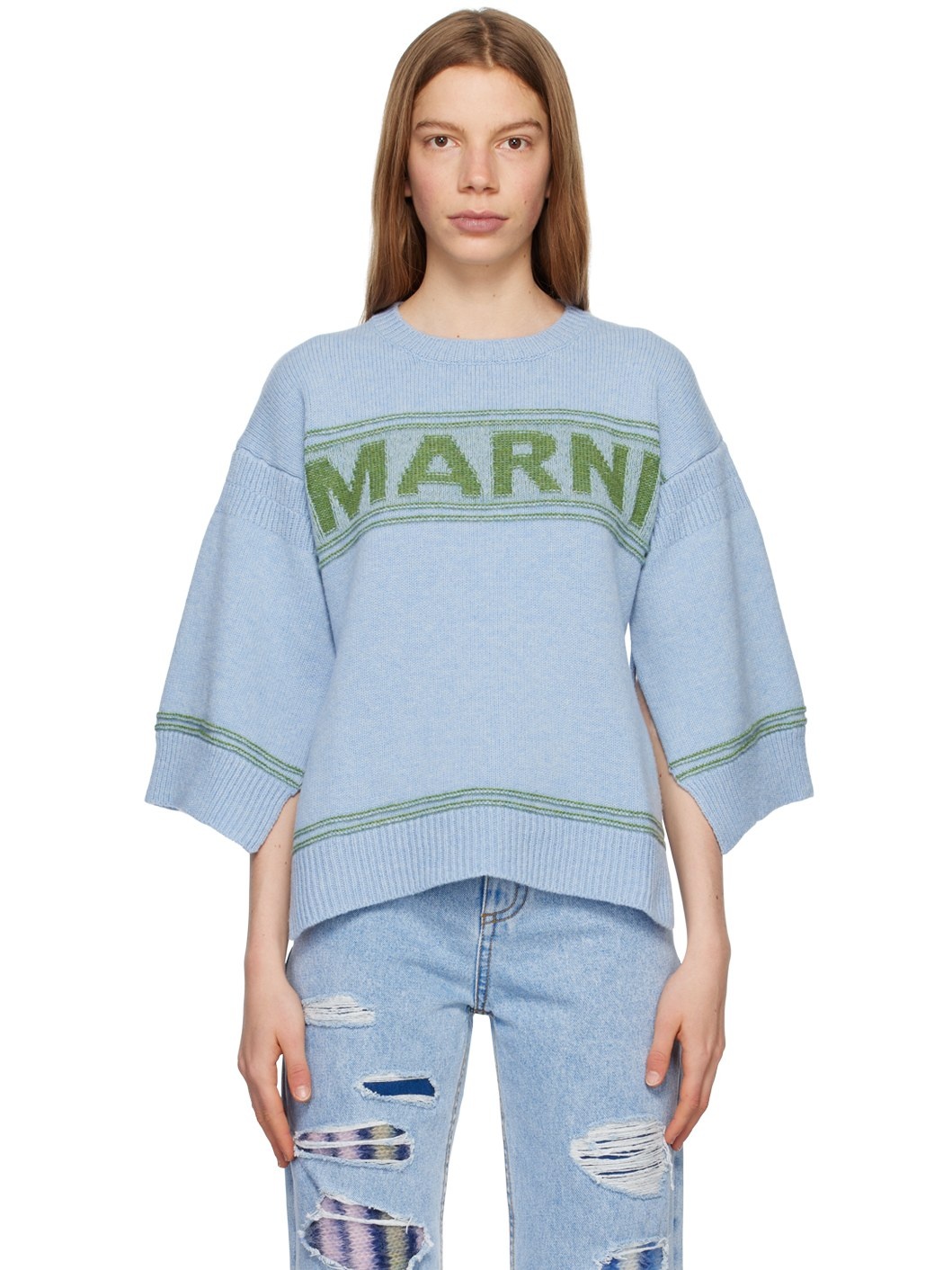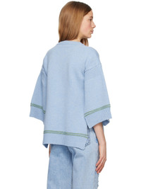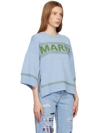 Knit virgin wool sweater. · Rib knit crewneck, hem, and cuffs · Intarsia logo at front · Vented side seams and cuffs Supplier color: Pale blue