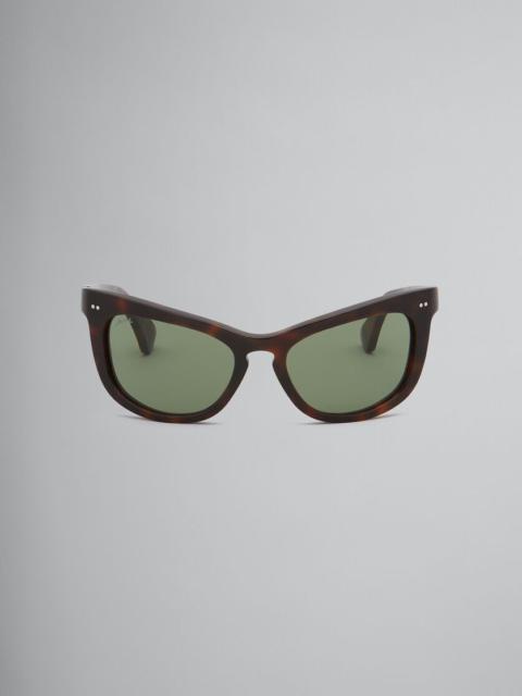 Isamu sunglasses made from thick acetate. Innovative take on classic 1950s silhouettes, featuring a futuristic stretched V-shaped browline. Green lenses. Made in Italy MODEL EWME0053X0H3700029FD