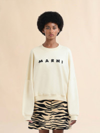 Crew neck jersey cotton sweater with a Marni logo printed across the chest. The relaxed fit has a drop shouler, and ribbed knit trims. MODEL FLJE0185P7USCX43SLW06 FIT The model is 5' 9''. The model is wearing size 40 IT. COMPOSITION Primary Fabric: 100% Cotton Knit