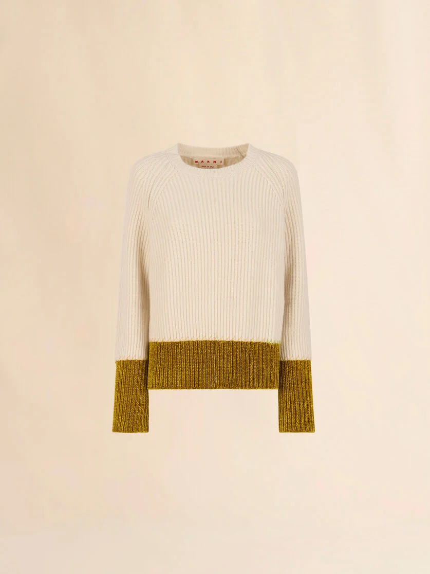 Color-block sweater made from a virgin wool and viscose blend in a fisherman's rib knit. Regular fit with long sleeves and crew neck. Features handmade Marni logo and mending details on the body and sleeves. Made in Italy MODEL GCMD0632Q0UFH553BIW10