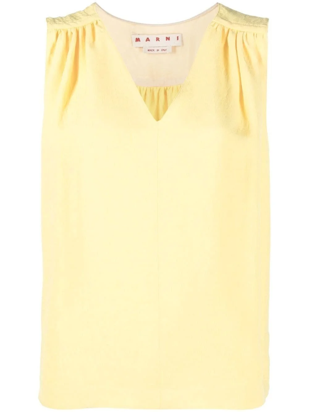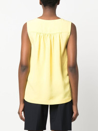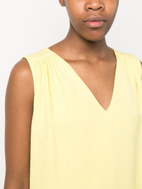 jacquard ruched top lemon yellow full jacquard ruched detailing fluid V-neck sleeveless short side slits straight hem Made in Italy Composition Viscose 100% SIZE & FIT Model measurements Height 5 ft 9 in(1.76 m) Bust/Chest 33.07 in(84 cm) Hips 38.58 in(98 cm) Waist 24.8 in(63 cm) FittingInformation This piece fits true to size. We recommend you get your regular size Cut for a loose fit Made with a mid-weight fabric Washing instructions Dry Clean Only