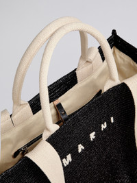 Raffia East-West tote bag. Twin handles in cotton ribbon and fixed shoulder strap. Fabric lining. Interior zip pocket. Palladium hardware. Front contrast-embroidered Marni logo. Made in Italy. DETAILS FIT Large size. Can be carried by hand or worn over the shoulder. COMPOSITION Body: 52% Cotton 48% Polyamide-Nylon - Contrast: 97% Cotton 3% Polyester - Lining: 100% Cotton - Contrast: 100% Calf Leather - Metallic Parts: 100% Brass