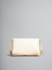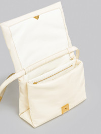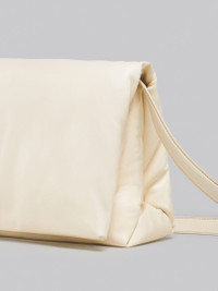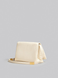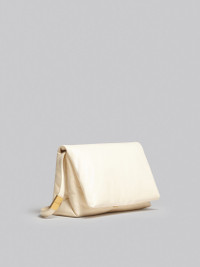 Prisma bag, large size, made of calfskin puffy leather. Flap closure with metal clasp, opening to reveal two compartments and an inside zip pocket. Leather shoulder strap with extension. Shiny gold color hardware. Embossed Marni gold logo in the back. Lining in leather-like coated fabric. Made in Italy DETAILS COMPOSITION Body: 100% Calf Leather - Lining: 55% Cotton 45% Polyurethane - Metallic Parts: 100% Brass