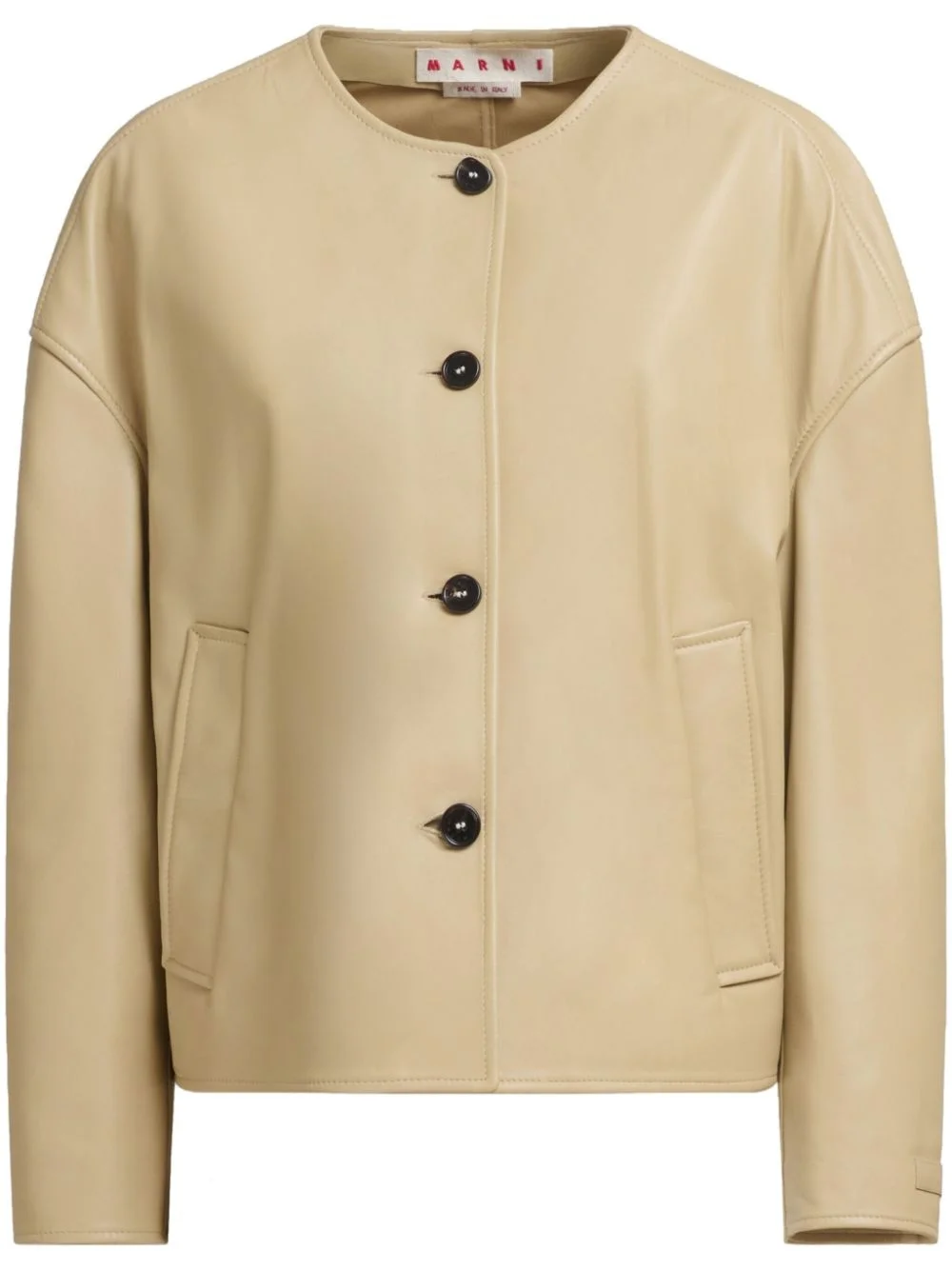 leather jacket Highlights - Beige - Leather - Smooth grain - Front button fastening - Crew neck - Drop shoulder - Long sleeves - Two side welt pockets - Straight hem Made in Italy Composition Ovine Leather (top grain) 100%