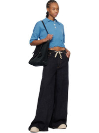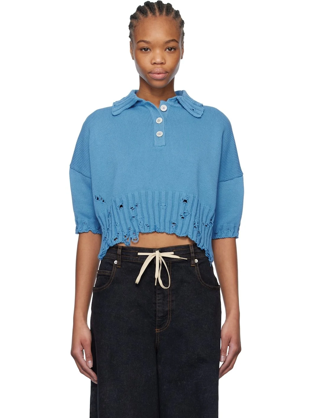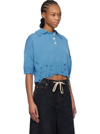Knit cotton polo. Distressing throughout. · Rib-knit spread collar, cropped hem, and cuffs · Three-button placket · Hand-embroidered logo at back collar Supplier color: Azure 100% cotton. Made in Italy 251379F108001