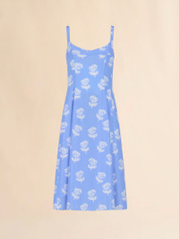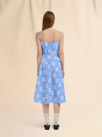 LIGHT BLUE POPLIN FLARED DRESS WITH SPRAYED ROSES PRINT
