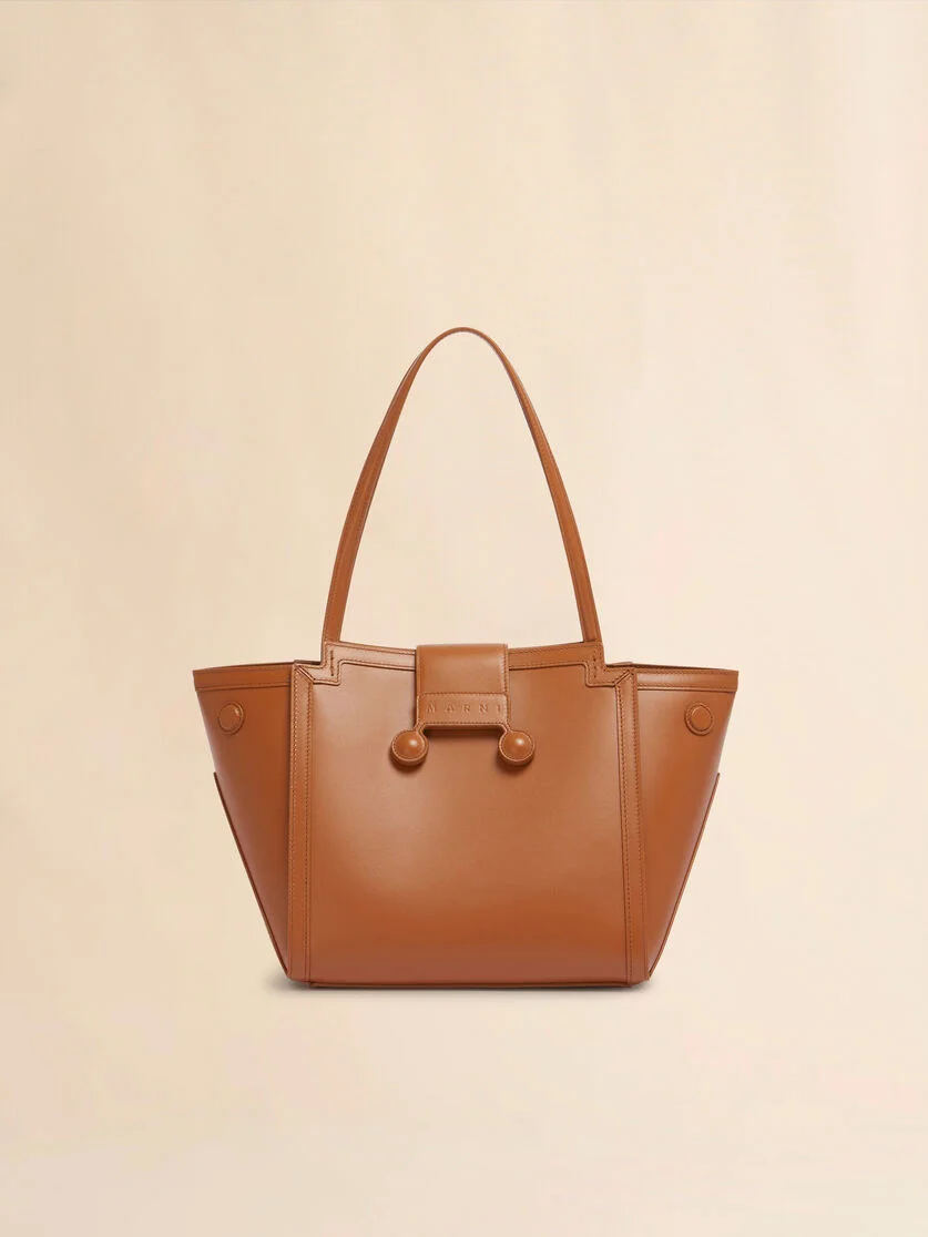 Mini Riviera bag made of smooth calf leather. Trapeze-shape with magnetic buttons on the sides. Leather trims and handles for hand or shoulder carry. Unlined interior with flat pocket. Magnetic leather closure with Marni lettering and two metal stud details. This product is made using leather from a Leather Working Group medalled tannery. LWG supports more responsible leather manufacturing across the globe. Made in Italy MODEL BMMP0152U0P819600M35 COMPOSITION Body: 100% Calf Leather - Lining: 100% Ovine Leather - Inside: 100% Calf Leather