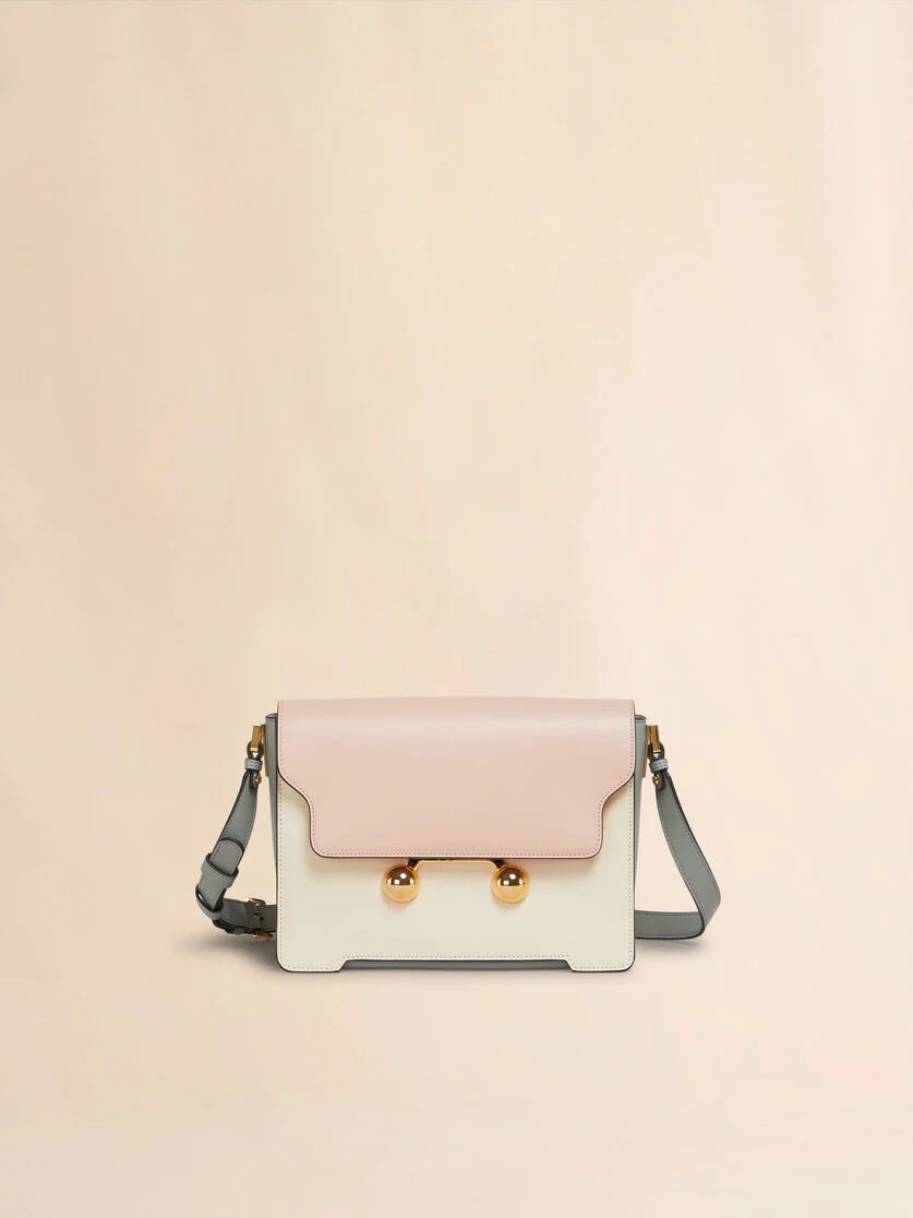 Trunkaroo medium rectangular shoulder bag crafted from calfskin leather. Colour block design. Front flap with magnetic closure, featuring engraved Marni lettering and oversized stud details. Contoured base on the front and back. One compartment with inside pocket. Lined in nappa leather. Detachable and adjustable buckled shoulder strap: can also be worn as a clutch. This product is made using leather from a Leather Working Group medalled tannery. LWG supports more responsible leather manufacturing across the globe. Made in Italy MODEL SBMP0195U1P6948ZO878 COMPOSITION Body: 100% Calf Leather - Lining: 100% Ovine Leather - Metallic Parts: 100% Brass - Metallic Parts: 100% Steel