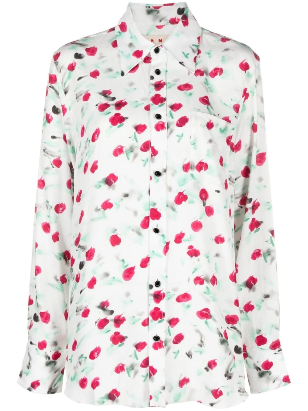 logo-buttons floral-print shirt Marni's playful take on garments permeates this crepe-texture shirt, emblazoned with an intricate and vibrant floral print. It is cut in Italy to a flowy relaxed silhouette. Highlights - White/multicolour - Crepe texture - Pleat detailing to the sleeves - Box-pleat detail to the rear - Floral print - All-over logo print - Logo-engraved buttons - Pointed flat collar - Front button fastening - Drop shoulder - Long sleeves - Buttoned cuffs - Chest patch pocket - Curved hem - Unlined Made in Italy Composition Viscose 100% SIZE & FIT Model measurements Height 5 ft 11 in(1.8 m) Bust/Chest 34.25 in(87 cm) Hips 35.82 in(91 cm) Waist 24.8 in(63 cm) Measurement SLEEVE LENGTH 22.83 in(58 cm) HIPS 38.18 in(97 cm) LENGTH 27.95 in(71 cm) WAIST 36.22 in(92 cm) FittingInformation Designed for a relaxed fit, this piece allows for comfort and movement when worn Made from a midweight non-stretch fabric This piece fits true to size – take your usual size Washing instructions Dry Clean Only