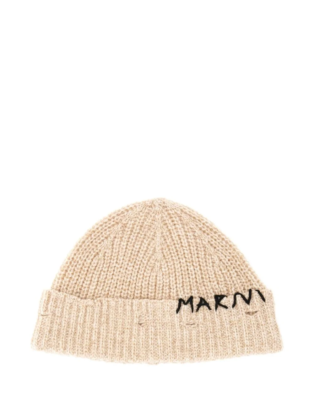 logo-embroidered beanie hat Highlights - Beige - Ribbed knit - Distressed effect Imported Composition Wool 100% Washing instructions Read Manufacturer Guidelines