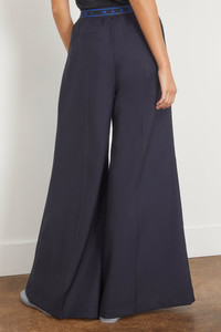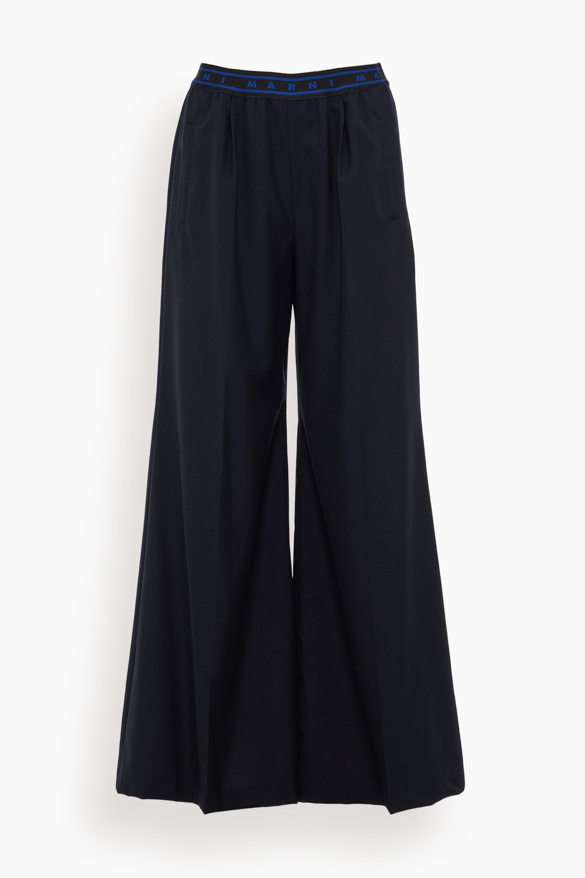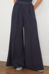 The Marni Trouser in BluBlack are a must-have piece from their PreFall 24 Collection. These trousers features a classic wide leg and creased front with an elastic waistband featuring the Marni logo. Wear yours with a cropped sweater and flats. FIT DESCRIPTION MODEL MEASUREMENTS - Fits true to size, take your normal size - Wide leg - Front crease - Marni logo - Elastic waistband - Side and back welt pockets - 100% Virgin wool - Harriet is wearing a size 38/ 2 US - Bust: 32" - Waist: 24" - Hips: 30.5" - Height: 5’8.5”