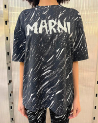 FINAL SALE The Scribble Logo T-Shirt in Black by Marni is an oversized, crewneck t-shirt featuring a scribble print with Marni logo printed across the front. Pair back to the matching trouser for a coordinated set. - Boxy fit