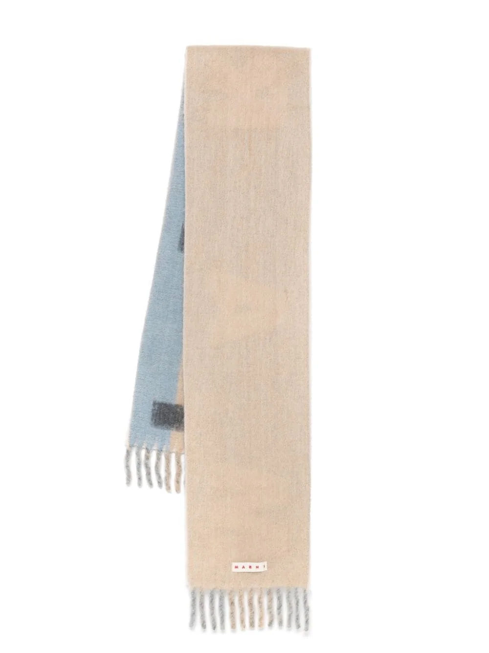 logo striped scarf Highlights - Sand beige - Wool-mohair-alpaca wool blend - Brushed finish - Jacquard logo motif - Rectangle shape - Fringed edge Made in Italy Composition Wool 50%, Polyamide 20%, Mohair 15%, Alpaca 15% SIZE & FIT Measurement LENGTH 94.48 in(240 cm) WIDTH 11.81 in(30 cm)