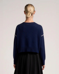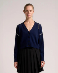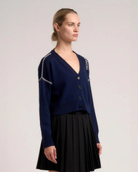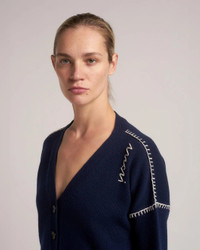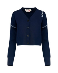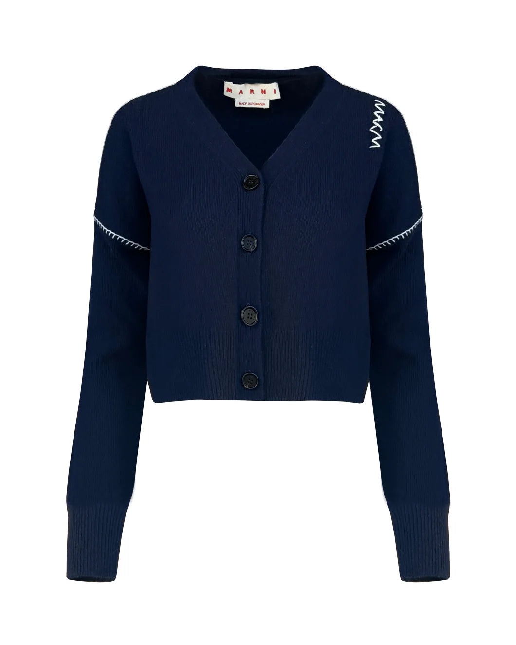 The Long Sleeve Cardigan with Marni Mending in Navy by Marni is a long sleeve, cropped cardigan featuring a v-neckline, contrast seams, and stitched Marni logo. - Primary Fabric: 70% Virgin Wool Knit 30% Kashmir Knit